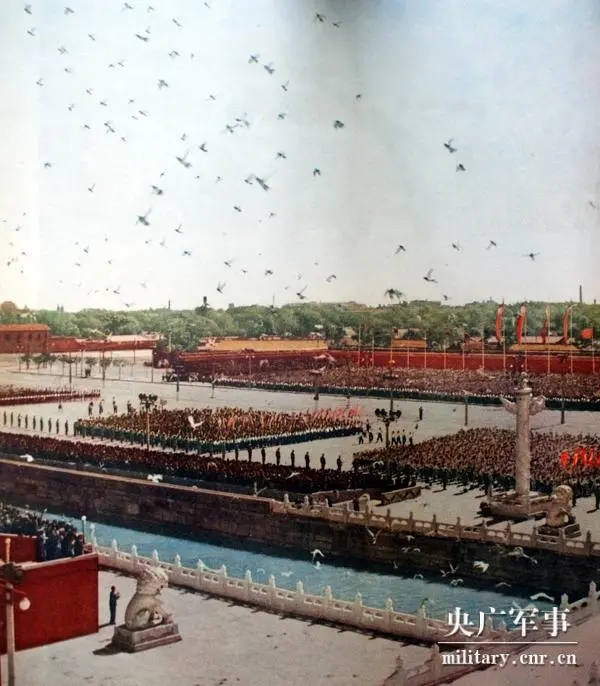 游行群眾在天安門檢閱臺前放飛一群一群的和平鴿,象征著中國人民保衛(wèi)和平的堅強意志。