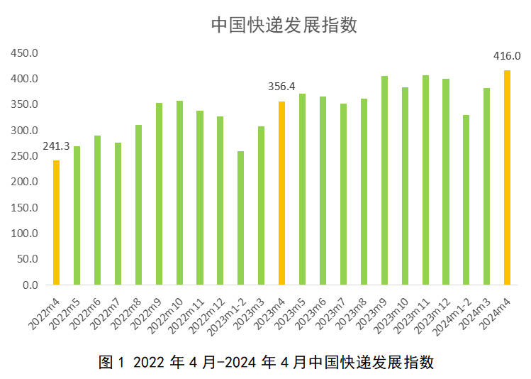 5月13日,國家郵政局發(fā)布2024年4月中國快遞發(fā)展指數(shù)報(bào)告。經(jīng)測算,2024年4月中國快遞發(fā)展指數(shù)為416,同比提升16.7%。其中發(fā)展規(guī)模指數(shù)、服務(wù)質(zhì)量指數(shù)和發(fā)展能力指數(shù)分別為494.2、648.8、221.0,同比分別提升27.7%、15.5%、3.5%,發(fā)展趨勢指數(shù)為67.7。4月,行業(yè)市場規(guī)模穩(wěn)步增長,服務(wù)質(zhì)效不斷提升,發(fā)展能力有所增強(qiáng),運(yùn)行態(tài)勢整體向好。