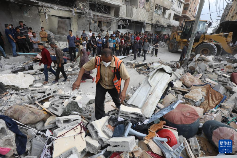 5月14日,在加沙地帶中部努賽賴(lài)特難民營(yíng),一名男子在建筑廢墟中搜尋。新華社發(fā)(巴勒斯坦通訊社供圖)