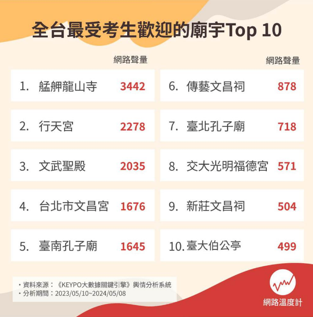 在臺灣,廟宇不僅是宗教信仰的中心,也是許多考生和家長在考前尋求心靈寄托的地方,5月18、19日初中會考就要登場,《網絡溫度計DailyView》透過《KEYPO大數據關鍵引擎》輿情分析系統(tǒng),調查全臺最受考生歡迎的廟宇Top 10。