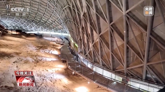 總臺記者佘利霞:這里就是整座遺址當(dāng)中規(guī)模最大的三號館,那么在這兒可以看到非常震撼的一幕,這一整面山,大家看到的都是恐龍蛋的化石,那么從空中俯瞰,可以說是數(shù)千枚的恐龍蛋是盡收眼底。