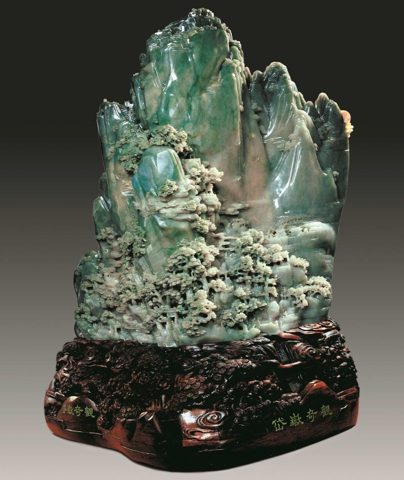 收藏于中國工藝美術(shù)館(中國非物質(zhì)文化遺產(chǎn)館)的翡翠玉雕作品中,有四件大型翡翠藝術(shù)珍品,堪稱“翡翠國寶”。四件作品均由北京市玉器廠承擔(dān)制作,可謂各具特色,各盡其美。其中有一件翡翠山子作品“岱岳奇觀”,原材料是四塊玉料中最大的一塊,屬于難得一見的稀世珍寶,在多領(lǐng)域?qū)<业闹笇?dǎo)和眾多能工巧匠的參與下,經(jīng)過精心研究、設(shè)計(jì)、雕琢,最終成功呈現(xiàn)出“造化鐘神秀”的壯麗山景,令人嘆為觀止。
