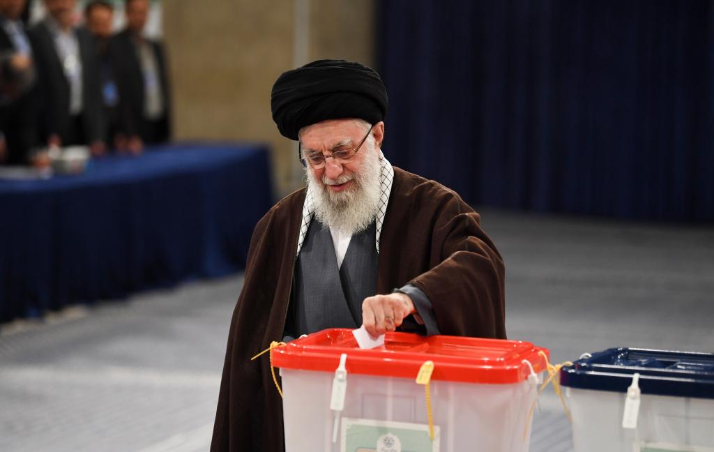 3月1日,在伊朗首都德黑蘭,伊朗最高領(lǐng)袖哈梅內(nèi)伊在設(shè)于領(lǐng)袖府內(nèi)的投票站參加伊朗議會(huì)選舉投票。(圖源:新華社)