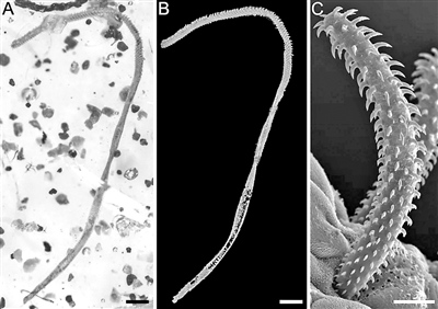 琥珀中的絳蟲化石(A, 光學(xué)顯微鏡圖像;B, 顯微計算機(jī)斷層掃描圖像)及與現(xiàn)生錐吻目(C, 電子顯微鏡圖像)的比較。