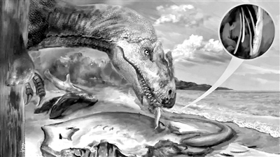 場景復(fù)原圖。絳蟲可能寄生在鰩魚的腸道內(nèi),擱淺后被一只恐龍捕食,恐龍取食鰩魚內(nèi)臟時,絳蟲被扯出來,掉在了附近的琥珀中。