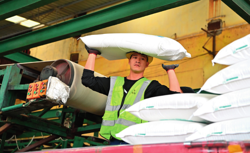 工作人員在廣西來賓小平陽湘桂制糖有限公司將白糖裝車(2023年12月12日攝)周華攝 / 本刊