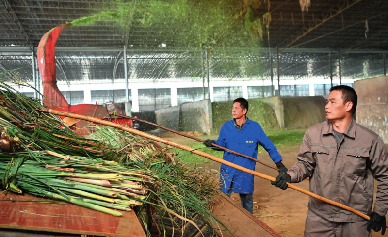 工作人員在廣西來賓市興賓區(qū)大灣鎮(zhèn)雙誠牧業(yè)有限公司粉碎甘蔗尾葉,準備制作牛飼料(2023年12月13日攝)周華攝 / 本刊