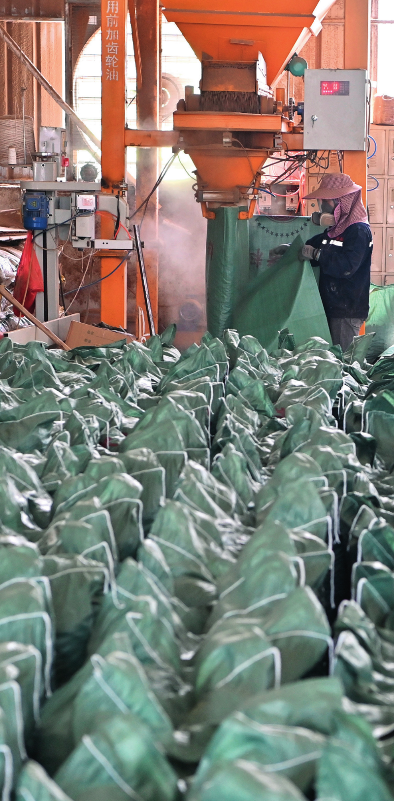 工作人員在廣西來賓小平陽鎮(zhèn)一家飼料廠將甘蔗葉為主要原料的飼料裝袋(2023年12月12日攝)周華攝 / 本刊
