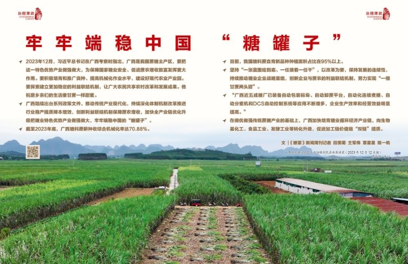 2023年12月,習(xí)近平總書記在廣西考察時指出,廣西是我國蔗糖主產(chǎn)區(qū),要把這一特色優(yōu)勢產(chǎn)業(yè)做強做大,為保障國家糖業(yè)安全、促進蔗農(nóng)增收致富發(fā)揮更大作用。要積極培育和推廣良種、提高機械化作業(yè)水平,建設(shè)好現(xiàn)代農(nóng)業(yè)產(chǎn)業(yè)園。要探索建立更加穩(wěn)定的利益聯(lián)結(jié)機制,讓廣大農(nóng)民共享農(nóng)村改革和發(fā)展成果。他祝愿鄉(xiāng)親們的生活像甘蔗一樣甜蜜。