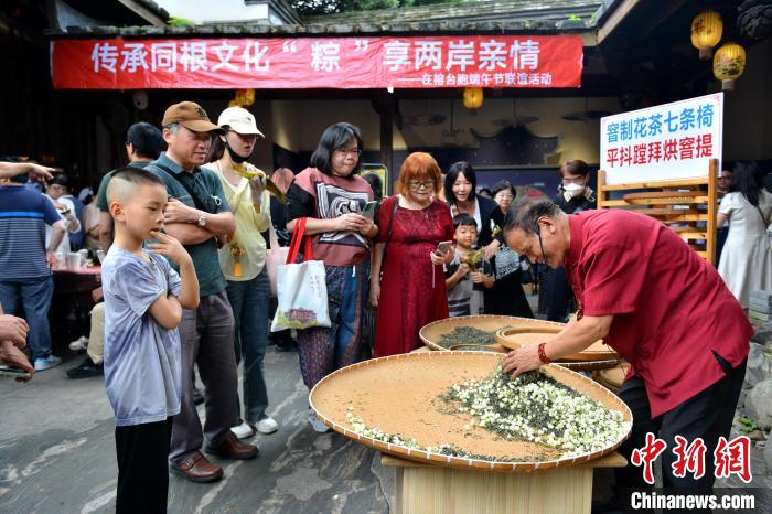 6月8日,傳承同根文化 “粽”享兩岸親情——在榕臺(tái)胞端午節(jié)聯(lián)誼活動(dòng)在位于福州的臺(tái)灣會(huì)館舉行,80余位在榕臺(tái)胞及兩岸婚姻家庭成員等代表參加。圖為福建省級(jí)非物質(zhì)文化遺產(chǎn)傳承大師張子健(右)現(xiàn)場(chǎng)演示福州茉莉花茶窨制工藝。呂明 攝