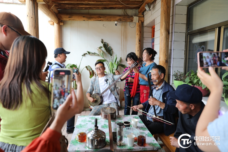“轉(zhuǎn)軸撥弦三兩聲,未成曲調(diào)先有情?!痹谖渫鲋葙t孝非遺傳承人賈旭峰的院子里,兩岸媒體人圍著幾位民俗表演藝人而坐,聽涼州賢孝的傳承與發(fā)展,感受中華民俗文化的魅力。在記者提議下,由賈旭峰以武威當?shù)乜谝粞莩_頭,現(xiàn)場兩岸同胞合唱膾炙人口的歌曲——《外婆的澎湖灣》。當武威口音遇上“臺灣腔”,當寶島臺灣的歌曲遇上祖國大西北的特色民俗,一場新奇的文化碰撞上演。院落中一片歡聲笑語,歌聲仿佛穿過海峽,在兩岸回蕩。