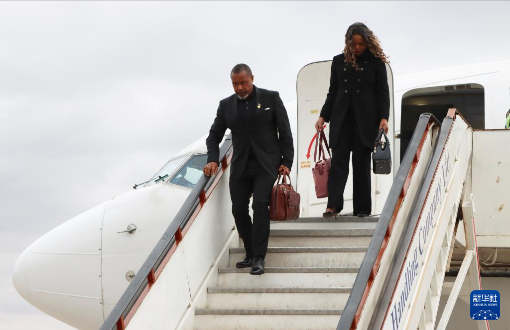 這是6月9日馬拉維副總統(tǒng)奇利馬(左)乘飛機抵達利隆圭后走下飛機的資料照片。(圖源:新華社)