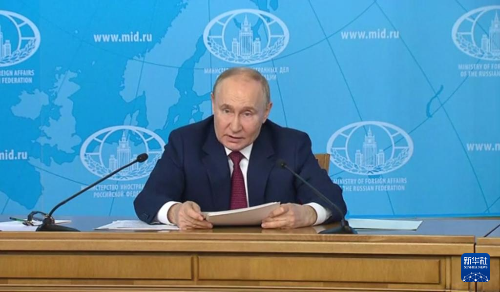 6月14日,在俄羅斯首都莫斯科,俄羅斯總統(tǒng)普京在俄外交部發(fā)表講話(視頻截圖)。(圖源:新華社)