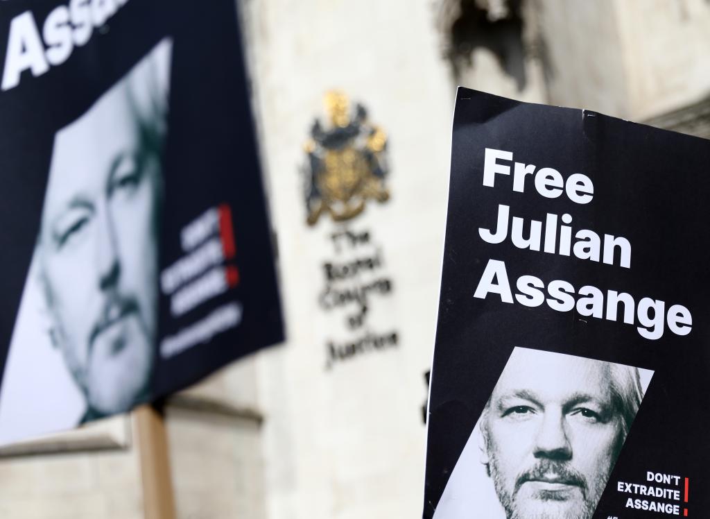 這是3月26日在位于倫敦的英國高等法院外拍攝的寫有“釋放阿桑奇”的標語牌。(圖源:新華社)