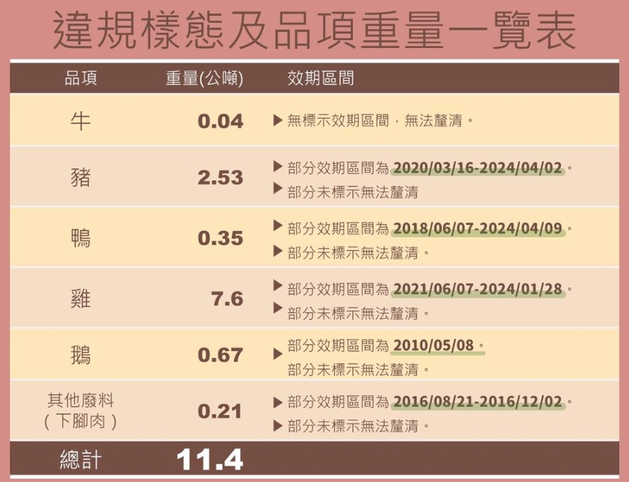 其中牛肉有0.04公噸無標示效期、豬肉有2.53公噸效期為2020年3月16日至2024年4月2日、鴨肉有0.35公噸效期為2018年6月7日至2024年4月9日、雞肉有7.6公噸效期為2021年6月7日至2024年1月28日、鵝肉有0.67公噸效期為2010年5月8日,廢料則有0.21公噸效期為2016年8月21日至2016年12月2日,尚有部分肉類則無效期標示。