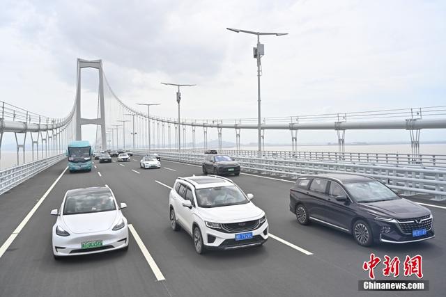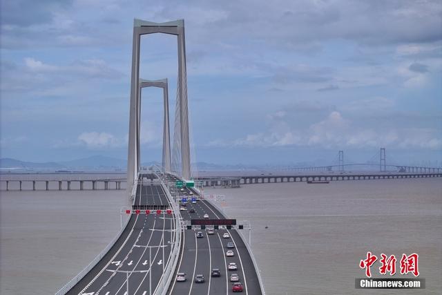 6月30日15時(shí),歷經(jīng)逾7年的建設(shè),粵港澳大灣區(qū)核心工程深中通道通車試運(yùn)營(yíng)。圖為廣東深圳,車輛行駛在深中大橋上。圖源:中新網(wǎng)