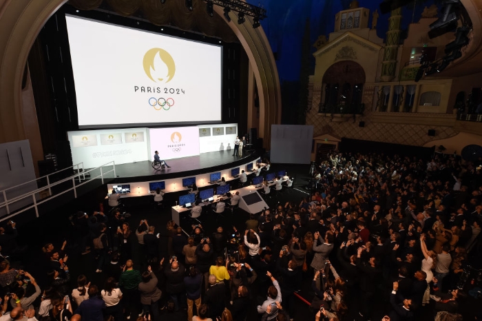 ↑2019年10月21日拍攝的巴黎2024年奧運會會徽發(fā)布儀式現(xiàn)場。新華社發(fā)(巴黎奧組委供圖)