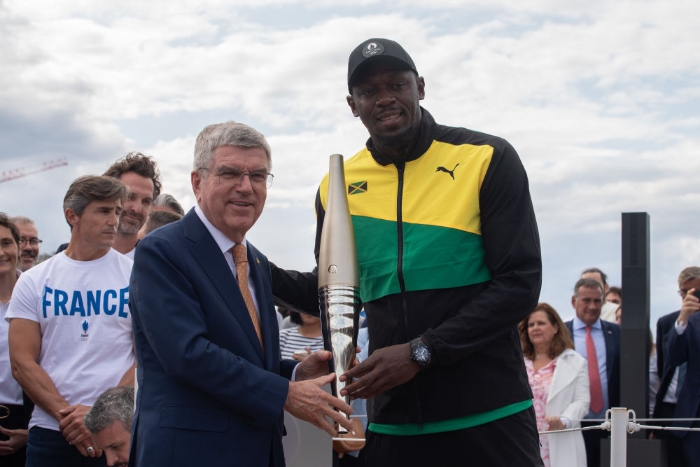 ↑2023年7月25日,國際奧委會主席巴赫(前左)和牙買加田徑名將博爾特在塞納河上展示火炬實(shí)物。新華社發(fā)(朱利安·馬蒂亞 攝)