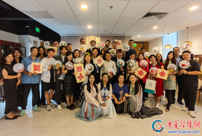 臺(tái)灣青年企業(yè)家代表展示親手制作的剪紙、花扇作品。(攝影:虞鷹)