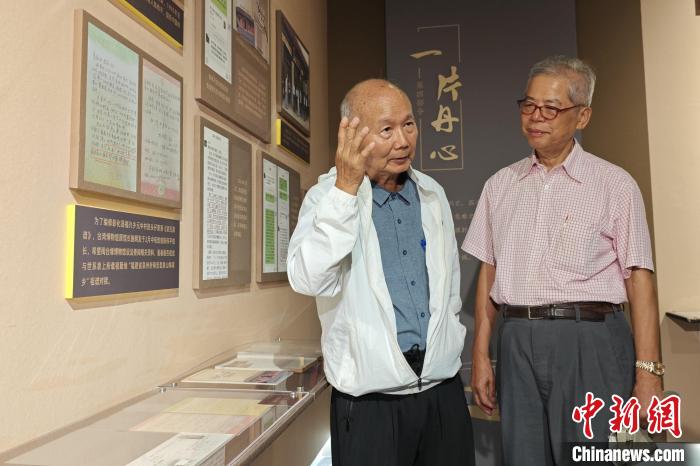 7月19日,施明發(fā)(左)在中國(guó)閩臺(tái)緣博物館講述兩岸梁氏家族的族譜對(duì)接故事?!枪跇?biāo) 攝