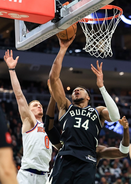 2024年4月7日,雄鹿隊球員安特托昆博(右)在比賽中上籃。當(dāng)日,在2023-2024賽季NBA常規(guī)賽中,紐約尼克斯隊客場122比109戰(zhàn)勝密爾沃基雄鹿隊。新華社發(fā)(喬爾·萊納攝)