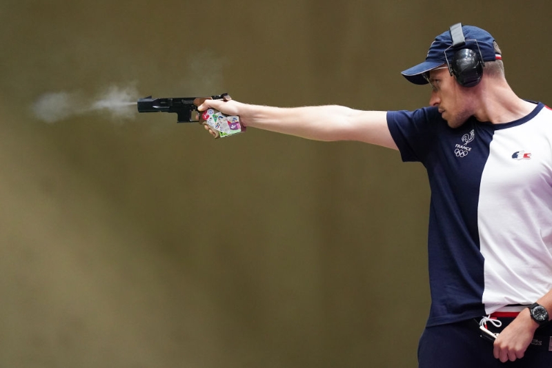 2021年8月2日,法國選手基康普瓦在比賽中。當(dāng)日,在東京奧運會射擊男子25米手槍速射決賽中,法國選手基康普瓦獲得金牌。新華社記者 鞠煥宗 攝