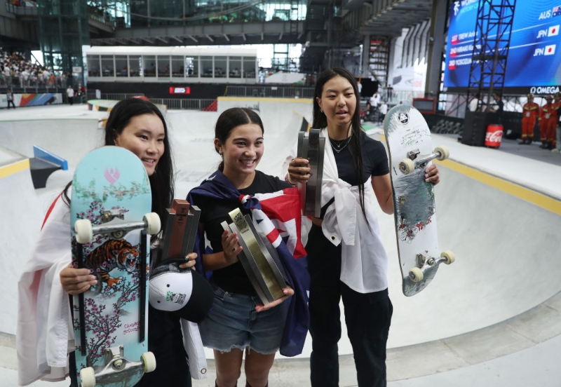 5月19日,冠軍澳大利亞選手阿麗莎·特魯(中)、亞軍日本選手開心那(右)與季軍日本選手四十住櫻在頒獎(jiǎng)儀式后合影。當(dāng)日,在巴黎奧運(yùn)會(huì)資格系列賽上海站滑板女子碗池決賽中,澳大利亞選手阿麗莎·特魯奪得冠軍,日本選手開心那與四十住櫻分獲二、三名。新華社記者 賈浩成 攝