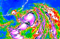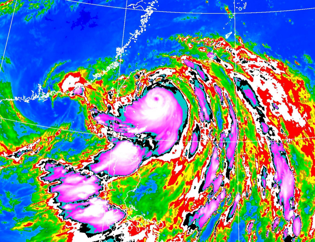 “格美”臺風(fēng)凌晨再度增強,暴風(fēng)半徑已達250公里,強度也達中臺上限,已有清晰可見的臺風(fēng)眼出現(xiàn)。(圖/臺氣象部門)