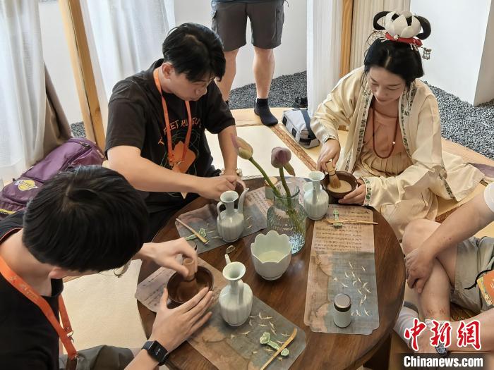 體驗(yàn)活動(dòng)中,臺(tái)胞們或試穿傳統(tǒng)服飾,或席地而坐跟隨老師學(xué)習(xí)宋代點(diǎn)茶。臺(tái)青吳同學(xué)告訴中新網(wǎng)記者,最近一段時(shí)間,宋代點(diǎn)茶、圍爐煮茶等茶文化現(xiàn)象在大陸陸續(xù)走紅,這股流行之風(fēng)也吹到了臺(tái)灣,成為島內(nèi)青年喜愛(ài)的社交方式。在大陸“打卡”各地特色的新茶飲,也成了臺(tái)青游覽大陸時(shí)的熱門(mén)項(xiàng)目。這次有機(jī)會(huì)親身體驗(yàn)電視劇上看到的宋代點(diǎn)茶,驚喜滿滿。