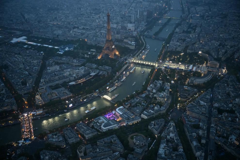 7月26日,第33屆夏季奧林匹克運(yùn)動會開幕式在法國巴黎舉行。這是從直升機(jī)視角拍攝的開幕式現(xiàn)場。新華社發(fā)