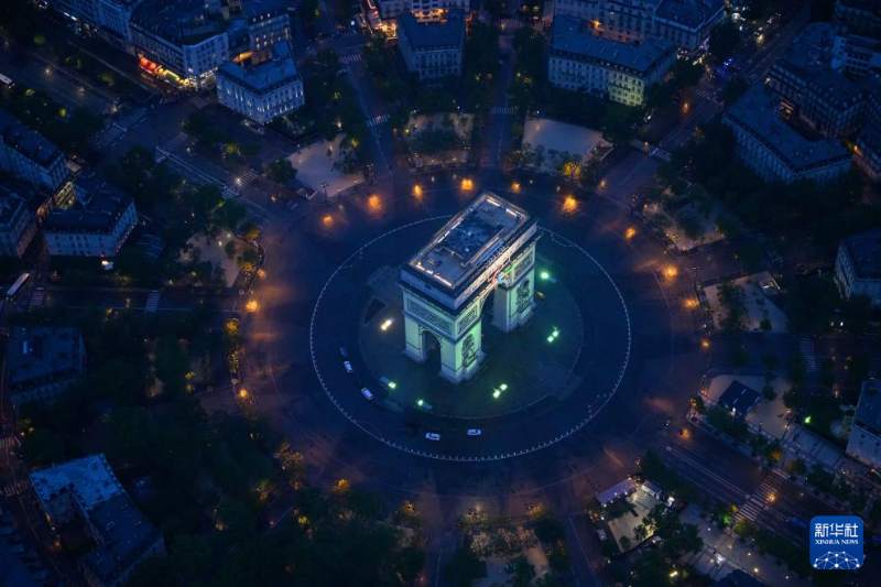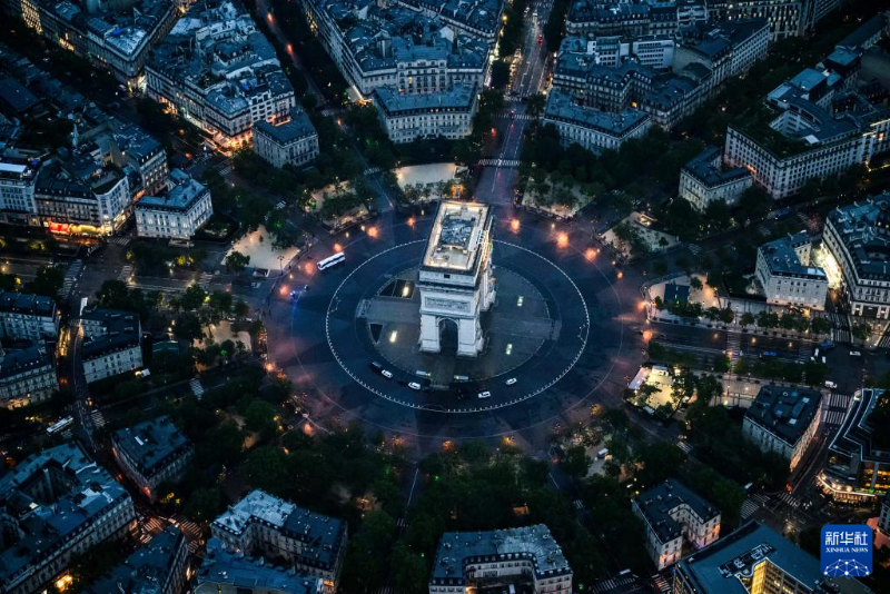 7月26日,第33屆夏季奧林匹克運(yùn)動(dòng)會(huì)開(kāi)幕式在法國(guó)巴黎舉行。這是從直升機(jī)視角拍攝的凱旋門。新華社發(fā)(POOL照片/利昂內(nèi)爾·博納旺蒂爾)