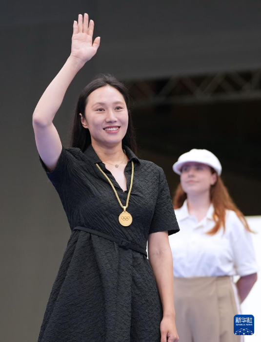 7月27日,中國選手黃雨婷在頒獎儀式上展示金牌。新華社記者 鞠煥宗 攝
