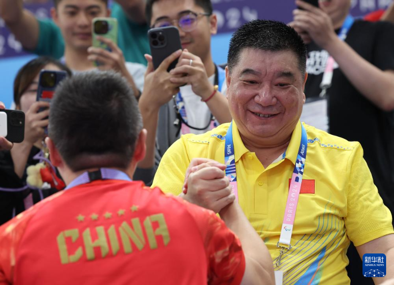7月27日,國際射聯(lián)副主席、中國射擊奧運(yùn)冠軍王義夫(右)在比賽后慶祝。新華社記者 趙丁喆 攝