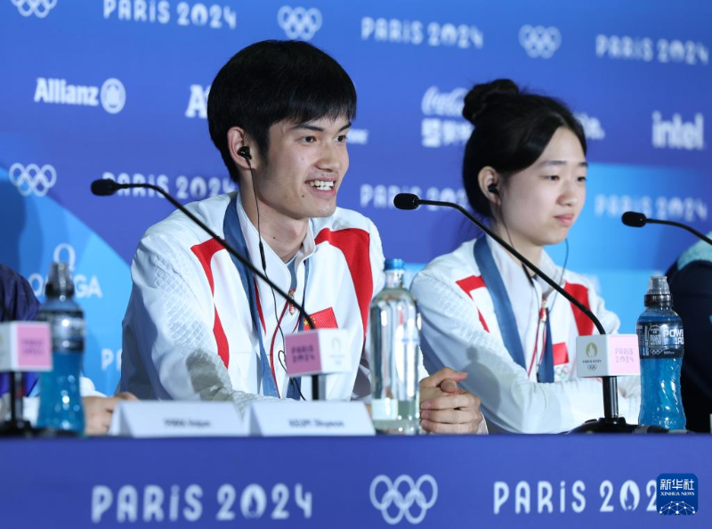 7月27日,冠軍中國選手黃雨婷/盛李豪(左)在賽后新聞發(fā)布會上。新華社記者 趙丁喆 攝