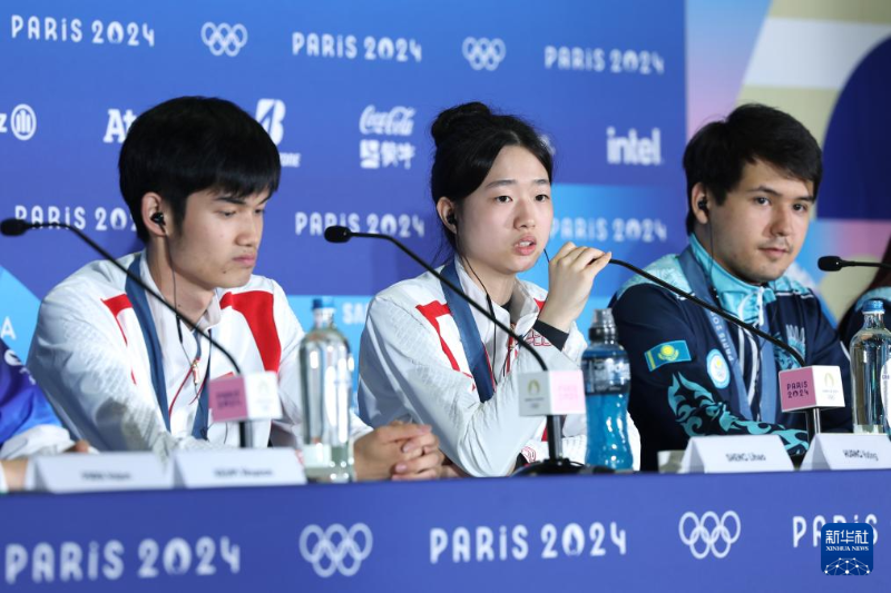 7月27日,冠軍中國選手黃雨婷(中)/盛李豪(左)在賽后新聞發(fā)布會上。新華社記者 趙丁喆 攝