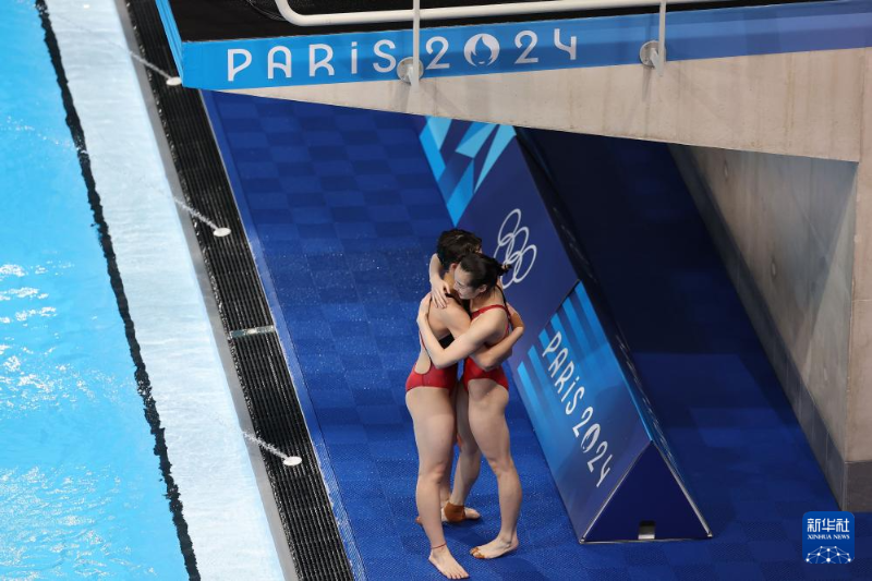 7月27日,中國選手昌雅妮(右)/陳藝文擁抱慶祝。新華社記者 李穎 攝