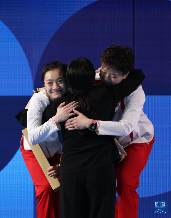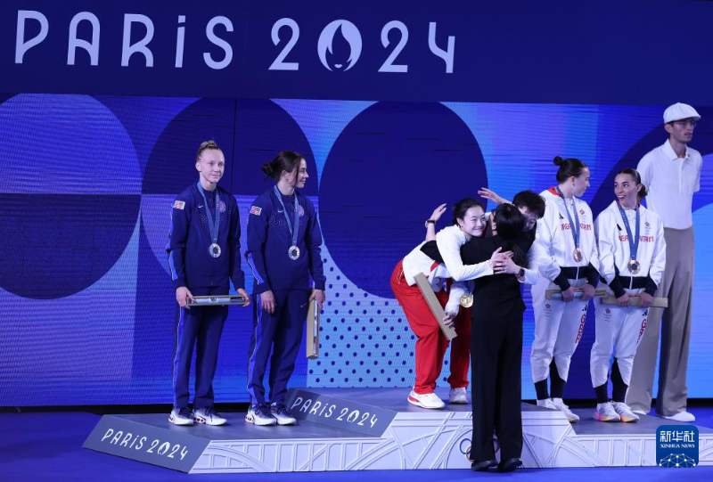 7月27日,中國選手昌雅妮(左一)/陳藝文(左三)在比賽中和參賽選手擁抱。新華社記者 李穎 攝
