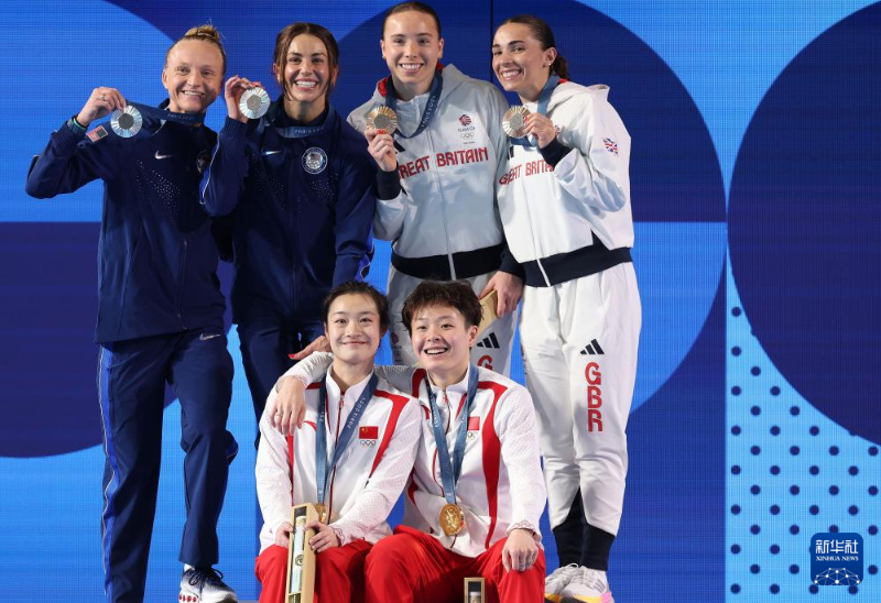 7月27日,冠軍中國選手昌雅妮(前左)/陳藝文(前右)、亞軍美國選手培根(后左一)/庫克(后左二)、季軍英國選手哈珀(后右二)/米尤-詹森(后右一)出席頒獎儀式。新華社記者 李穎 攝