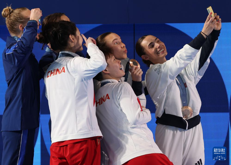 7月27日,獲獎選手在頒獎儀式上自拍。新華社記者 李穎 攝
