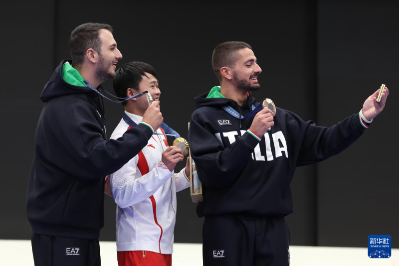 7月28日,冠軍中國選手謝瑜(中)、亞軍意大利選手費代里科·尼洛·馬爾迪尼(左)和季軍意大利選手保羅·蒙納在頒獎儀式上自拍留影。新華社記者 趙丁喆 攝