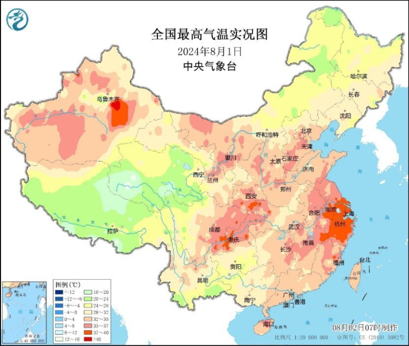 今天白天,江淮、江南大部、華南北部、四川盆地東部、重慶、陜西中南部、山西中部和西南部、河南西北部、山東北部和南部以及新疆北部、南疆盆地、吐魯番盆地等地有35℃以上高溫天氣,其中,安徽南部、江蘇南部、上海、湖北東南部、江西東北部、浙江、福建中北部、四川盆地東南部、重慶西部及新疆等地的部分地區(qū)最高氣溫37~39℃,局地可達40℃以上。