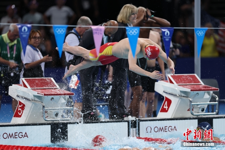 當(dāng)?shù)貢r間8月4日,巴黎奧運會男子4×100米混合泳接力決賽中,由徐嘉余、覃海洋、孫佳俊、潘展樂組成的中國隊獲得金牌。這是中國游泳隊巴黎奧運會第2枚金牌。圖為比賽現(xiàn)場。