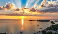 8月4日傍晚,江蘇淮安,航拍洪澤湖夕陽(yáng)美。洪澤湖清淡平靜的湖水,“孕育”出了豐富的水產(chǎn)資源和富有特色的旅游資源。(無(wú)人機(jī)照片)