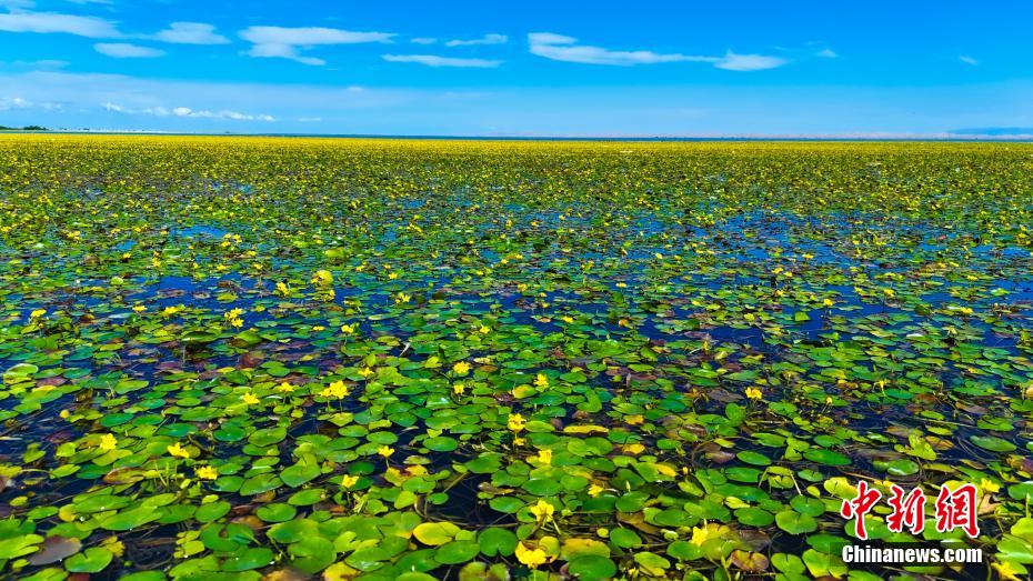 在博斯騰湖水面上,成片的荇菜花競(jìng)相綻放。