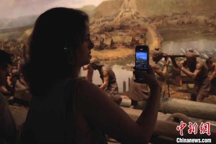 8月14日,亞歐青年領(lǐng)導(dǎo)人交流營活動在浙江杭州舉行,來自47個國家的50余名青年代表走進良渚博物院,感受五千年中華文明魅力。圖為一名青年在拍攝良渚先民勞作的塑像。中新社記者 鮑夢妮 攝