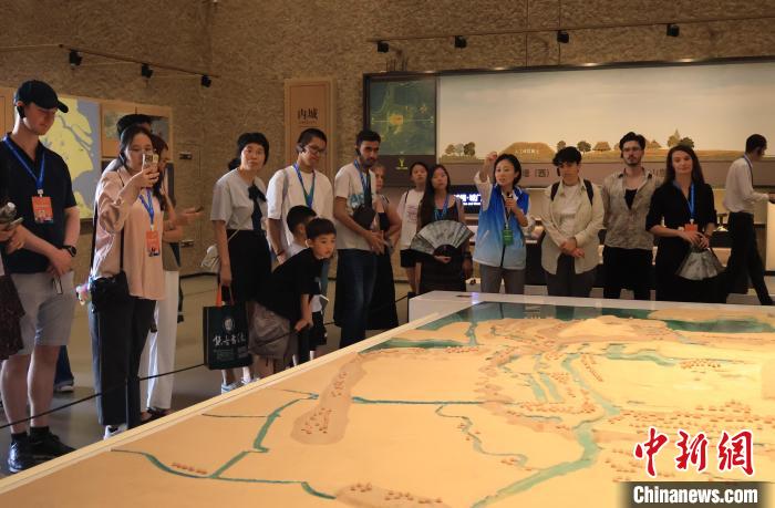8月14日,亞歐青年領(lǐng)導(dǎo)人交流營活動在浙江杭州舉行,來自47個國家的50余名青年代表走進良渚博物院,感受五千年中華文明魅力。圖為亞歐青年參觀良渚古城沙盤。中新社記者 鮑夢妮 攝