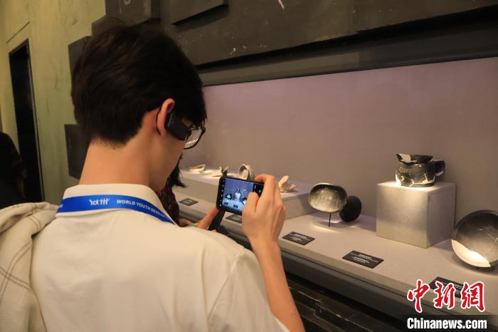 8月14日,亞歐青年領(lǐng)導(dǎo)人交流營活動在浙江杭州舉行,來自47個國家的50余名青年代表走進良渚博物院,感受五千年中華文明魅力。圖為一名青年拍攝展品。中新社記者 鮑夢妮 攝