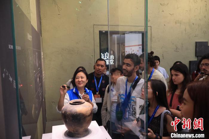 8月14日,亞歐青年領(lǐng)導(dǎo)人交流營活動在浙江杭州舉行,來自47個國家的50余名青年代表走進良渚博物院,感受五千年中華文明魅力。圖為亞歐青年參觀刻符陶罐。中新社記者 鮑夢妮 攝