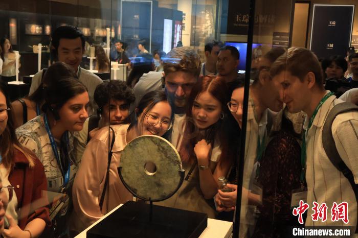 8月14日,亞歐青年領(lǐng)導(dǎo)人交流營活動在浙江杭州舉行,來自47個國家的50余名青年代表走進良渚博物院,感受五千年中華文明魅力。圖為亞歐青年參觀刻鳥立高臺符玉璧。中新社記者 鮑夢妮 攝