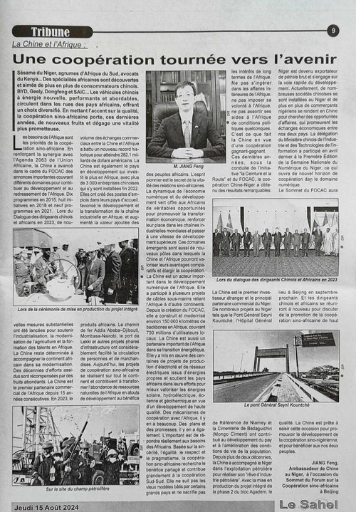 2024年8月15日,駐尼日爾大使蔣烽在尼發(fā)行量最大的官方報紙《薩赫勒》報發(fā)表題為《推動務實合作,創(chuàng)新點亮未來》的署名文章,宣介中非合作論壇北京峰會及中非務實合作。主要內容如下: